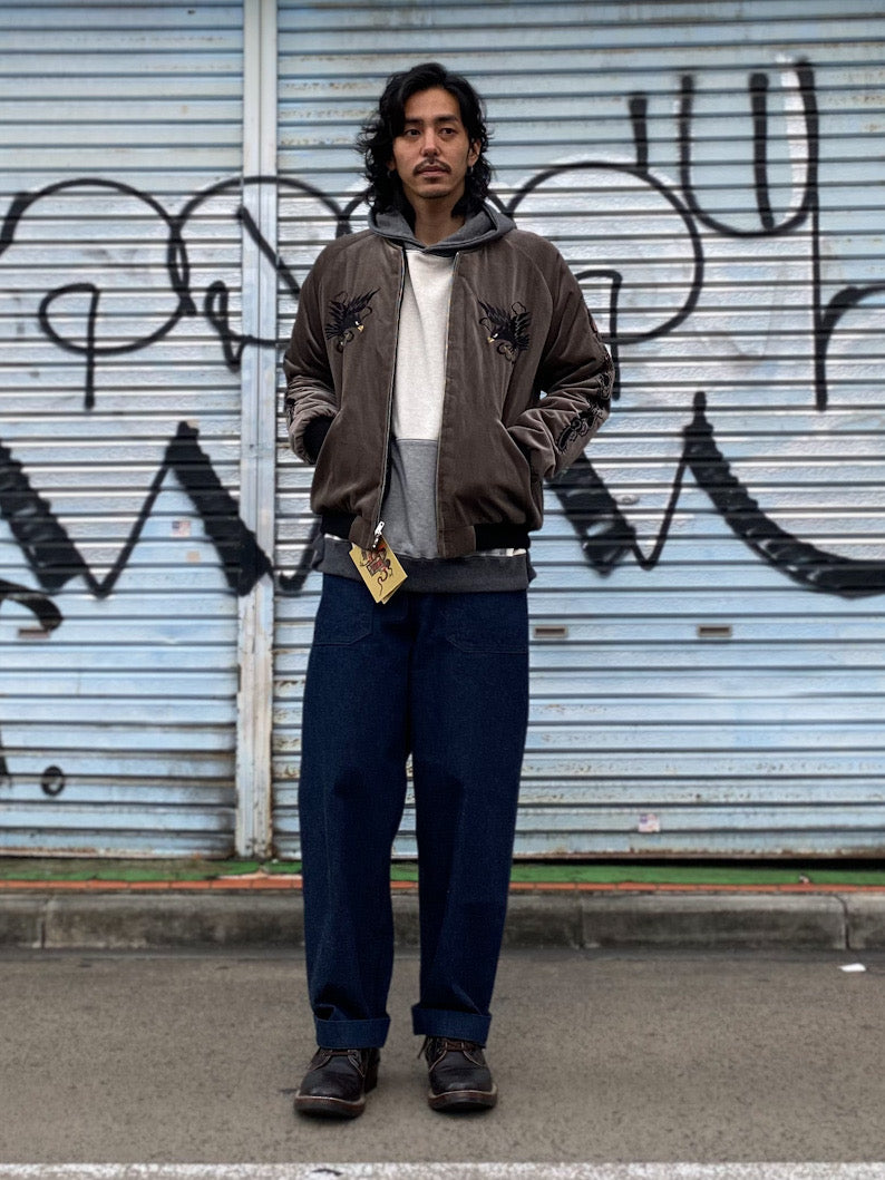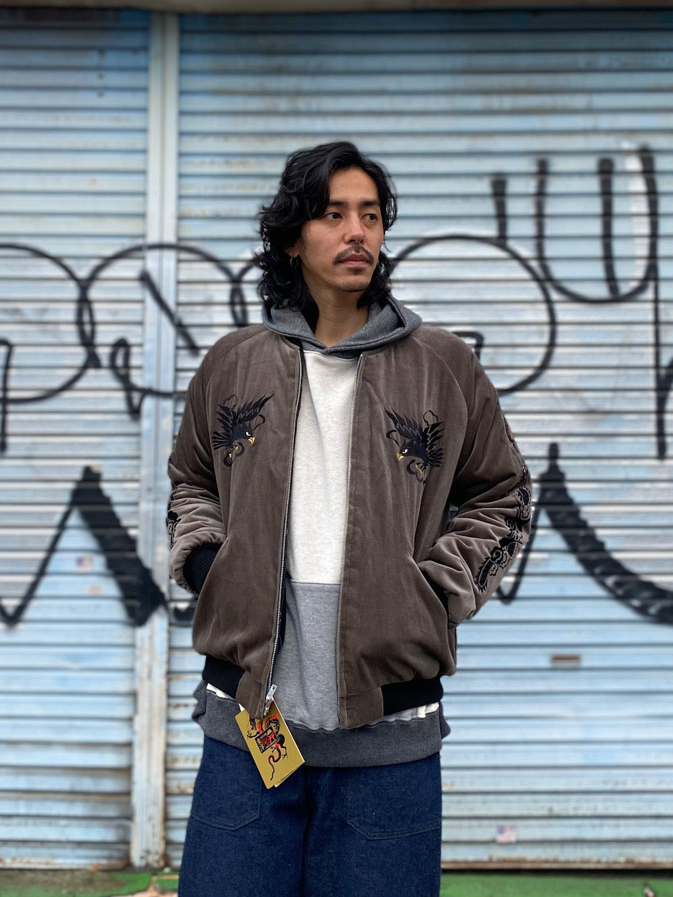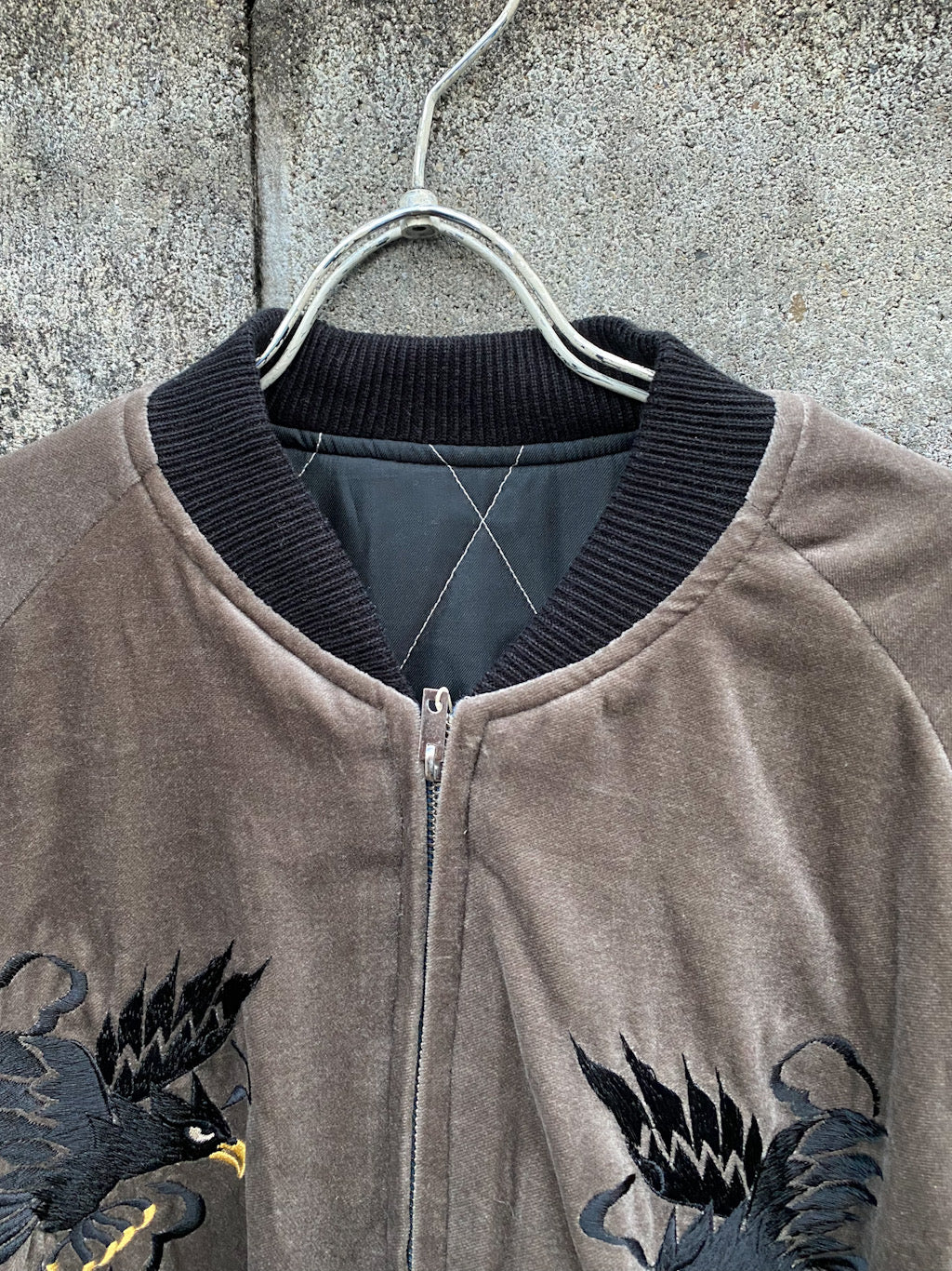 テーラー東洋では初となるグレーの別珍生地に、黒の鷲が描かれており、袖の2匹の龍はヴィンテージでは珍しい1950年代中期のデザインです。